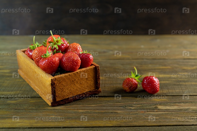 Сочная клубника лежит на деревянном столе. Летняя ягода крупным планом