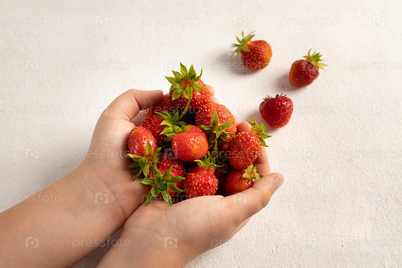 Детская рука держит клубнику на светлом фоне, тарелка с клубникой. Концепция летнего здорового питания. Вид сбоку