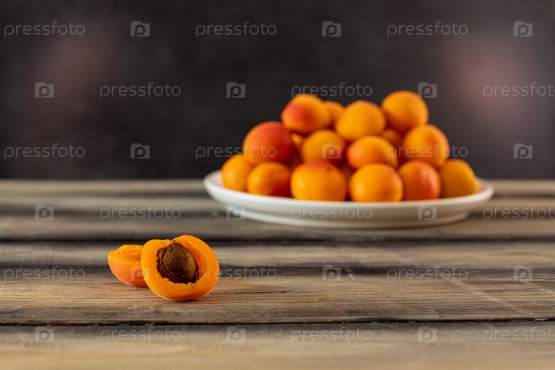 Свежие абрикосы. Спелый сочный абрикос в тарелке на деревянном столе. Массовые абрикосы