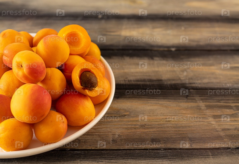 Свежие абрикосы. Спелый сочный абрикос в тарелке на деревянном столе. Массовые абрикосы