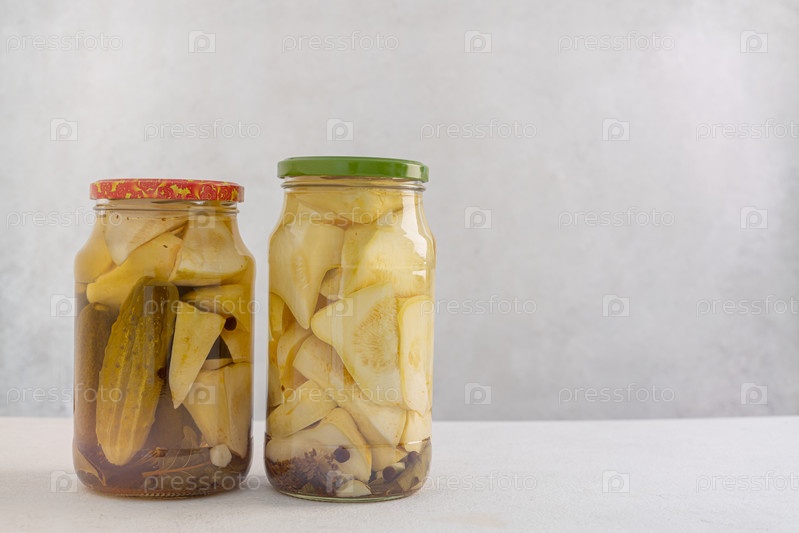 Маринады в стеклянной банке на светлом фоне. Домашние маринады. Здоровое питание