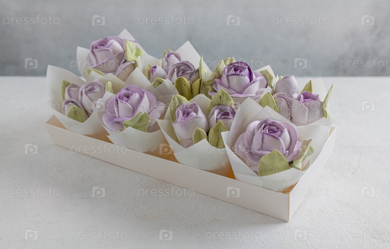 Зефирный букет цветов в подарочной коробке на светлом фоне, вид сверху, праздничная концепция, День святого Валентина