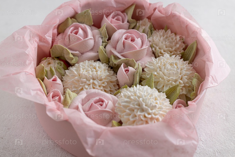Зефирный букет цветов в подарочной коробке на светлом фоне, вид сверху, праздничная концепция, День святого Валентина
