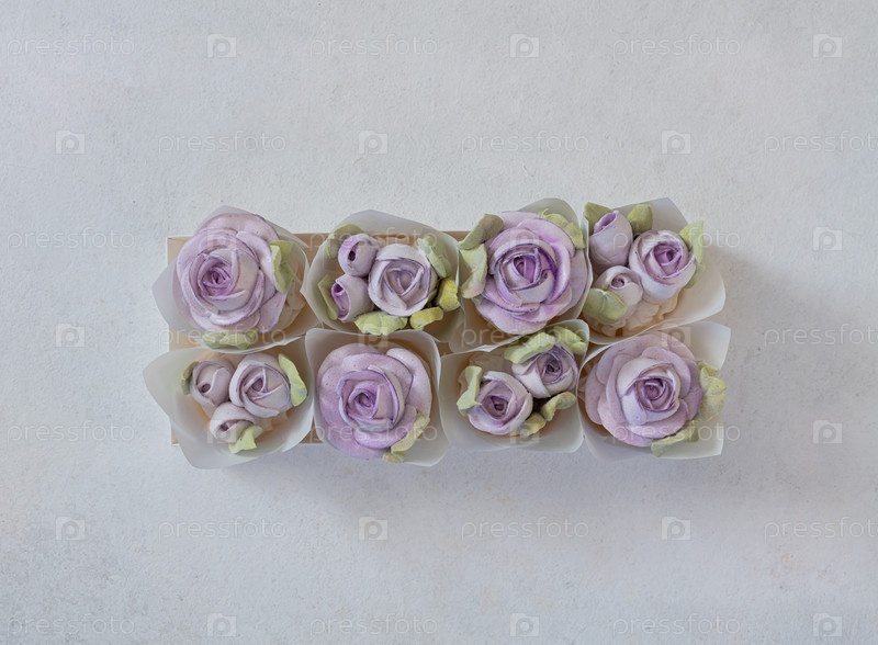 Зефирный букет цветов в подарочной коробке на светлом фоне, вид сверху