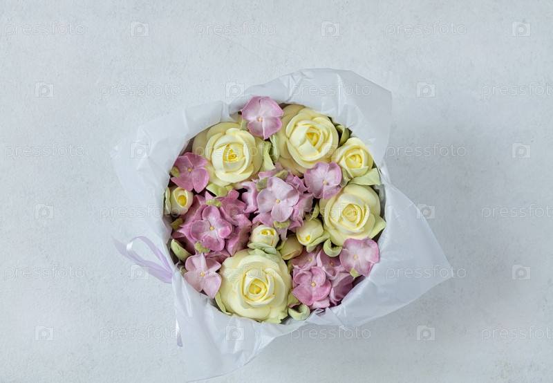 Зефирный букет цветов в подарочной коробке на светлом фоне, вид сверху, праздничная концепция, День святого Валентина