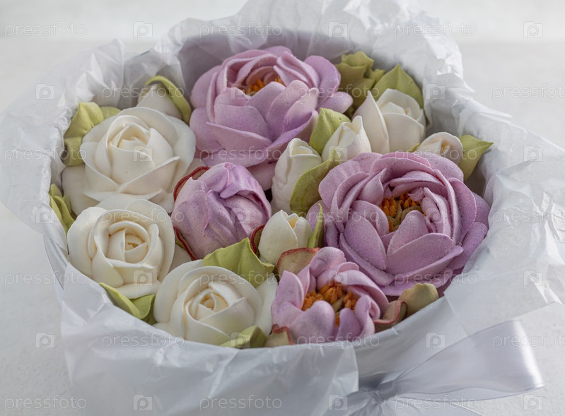 Зефирный букет цветов в подарочной коробке на светлом фоне, праздничная концепция