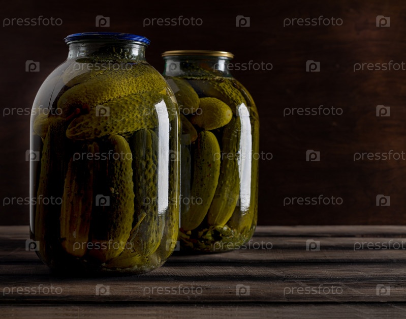 Консервированные маринованные огурцы в банках на фоне деревянного стола. Домашняя еда