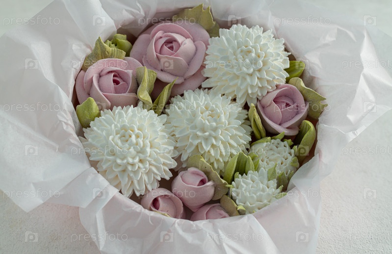 Зефирный букет цветов в подарочной коробке на светлом фоне, День святого Валентина