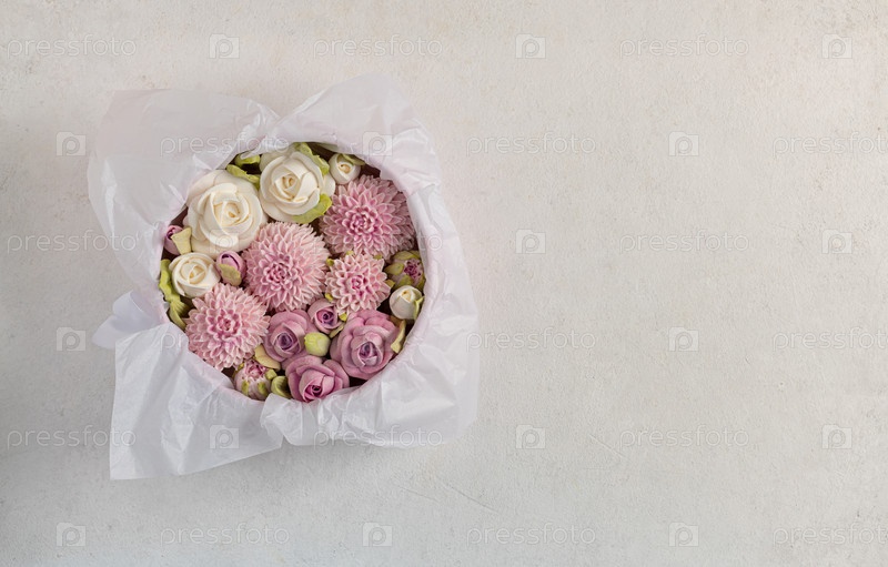 Зефирный букет цветов в подарочной коробке на светлом фоне, вид сверху, праздничная концепция, День святого Валентина