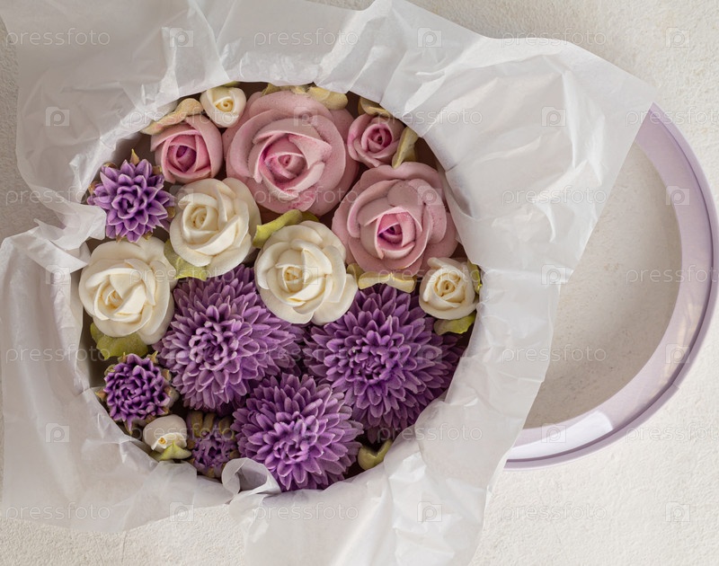 Зефирный букет цветов в подарочной коробке на светлом фоне, праздничная концепция, День святого Валентина
