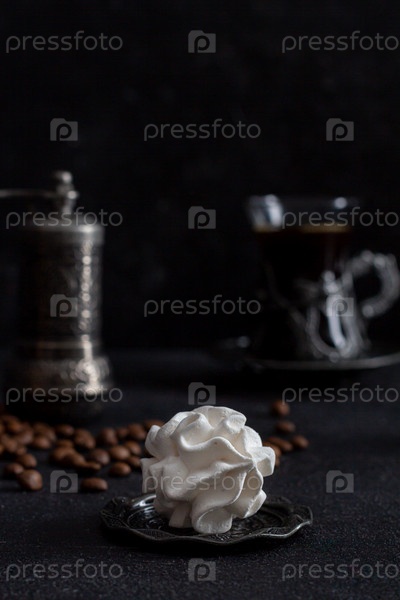 Зепфир на темном фоне в тарелке, на заднем плане - чашка кофе