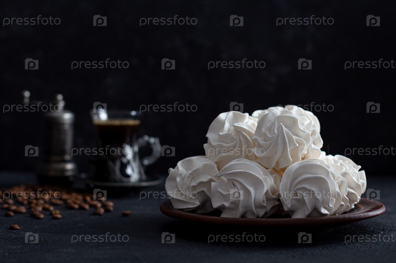 Зепфир на темном фоне в тарелке, на заднем плане - чашка кофе