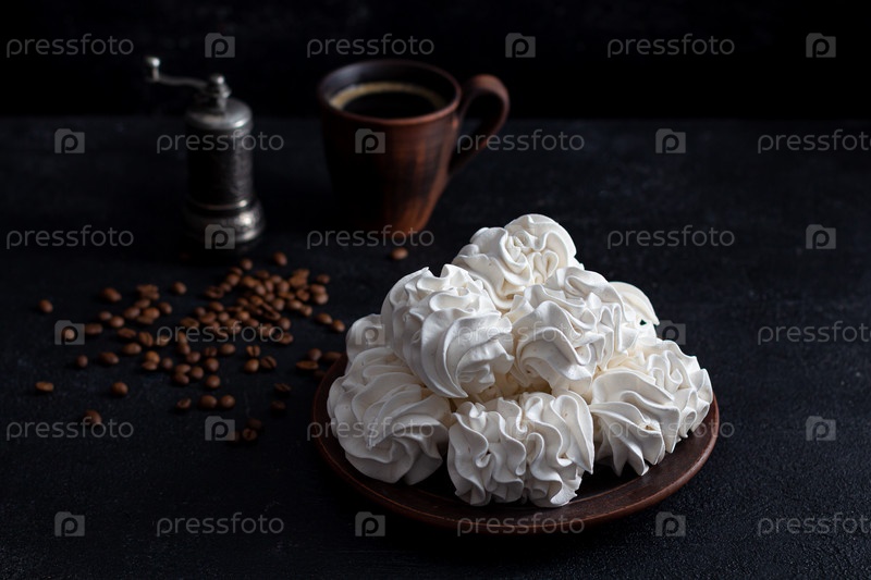 Зепфир на темном фоне в тарелке, на заднем плане - чашка кофе