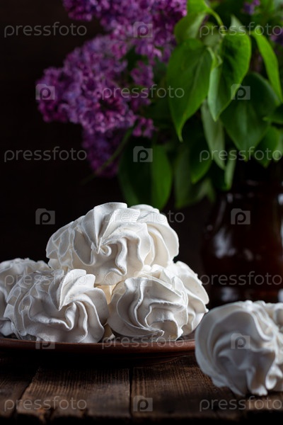 Яблочный зефир на деревянном фоне в тарелке, на заднем плане - чашка кофе, ветки сирени