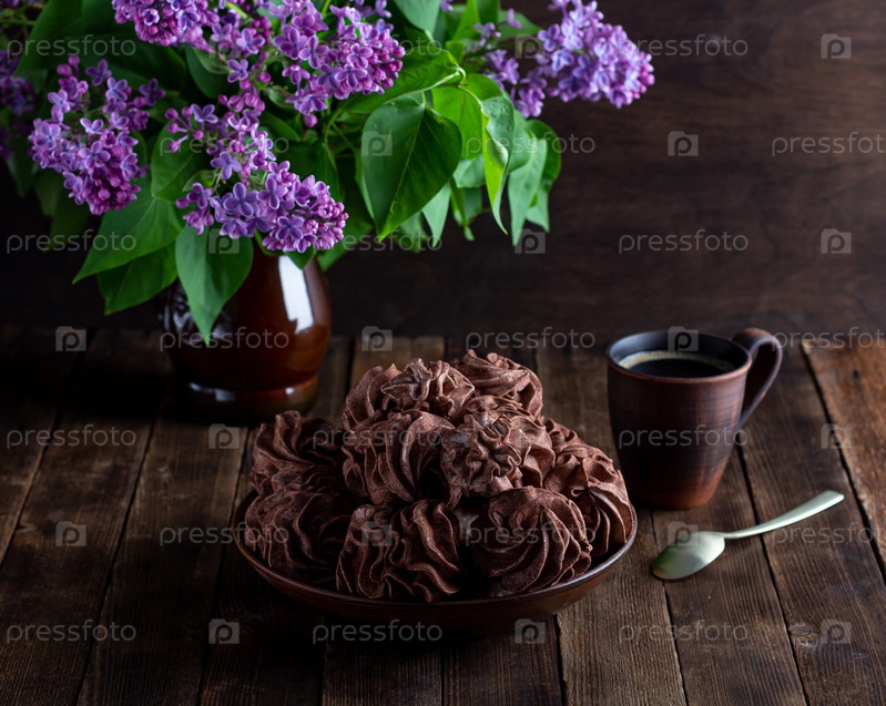 Кофе зефир на деревянном фоне в тарелке, на заднем плане - чашка кофе, ветки сирени