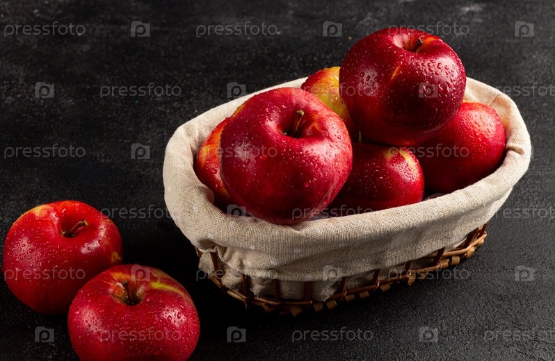 Свежие спелые красные яблоки на темном фоне, вид сбоку