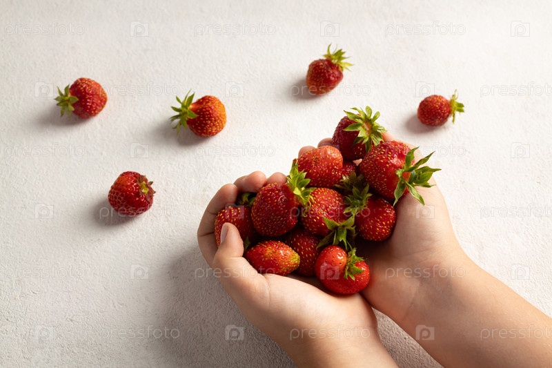 Детская рука держит клубнику на светлом фоне, тарелка с клубникой. Концепция летнего здорового питания. Вид сбоку