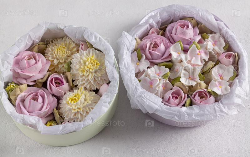 Зефирный букет цветов в коробке на сером фоне