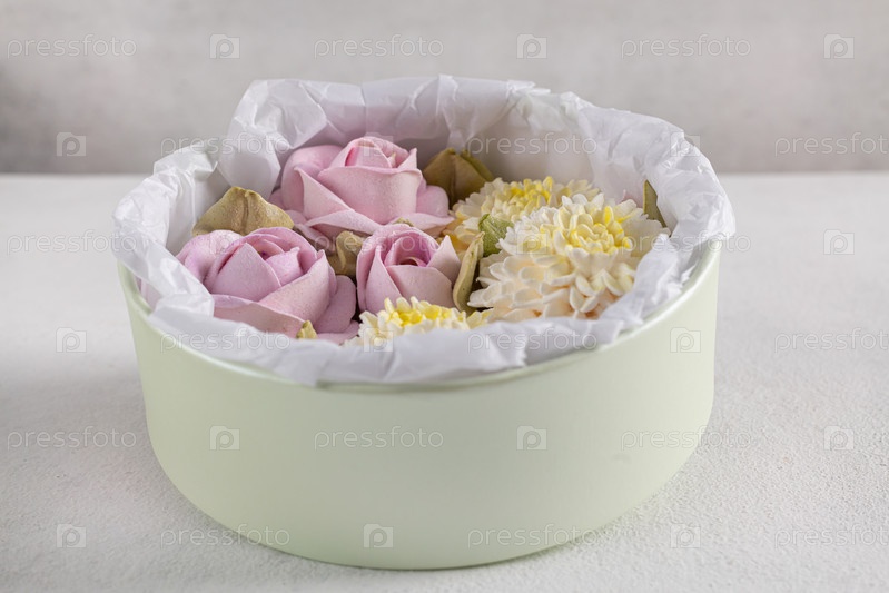 Зефирный букет цветов в коробке на сером фоне
