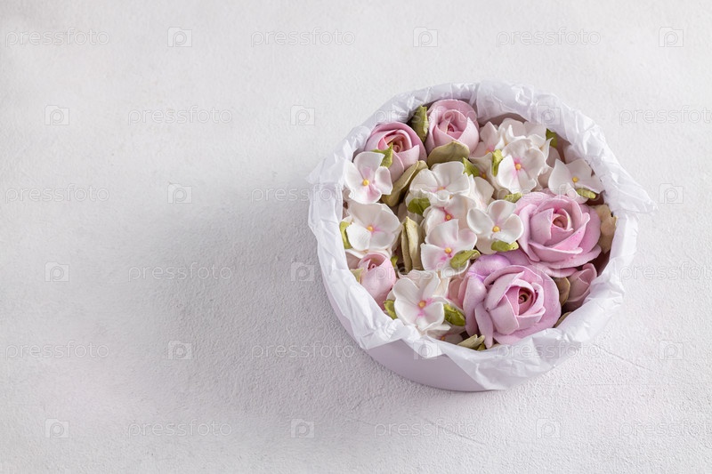 Домашний Зефир в подарочной упаковке, красивый нежный букет цветов Зефир, концепция праздника, подарки