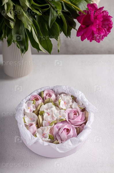 Зефирный букет цветов в коробке на сером фоне