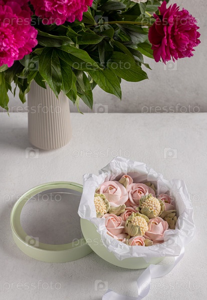 Зефирный букет цветов в коробке на сером фоне