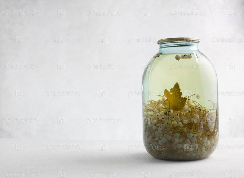 Компот из белой смородины, банка на белом фоне, копия пространства