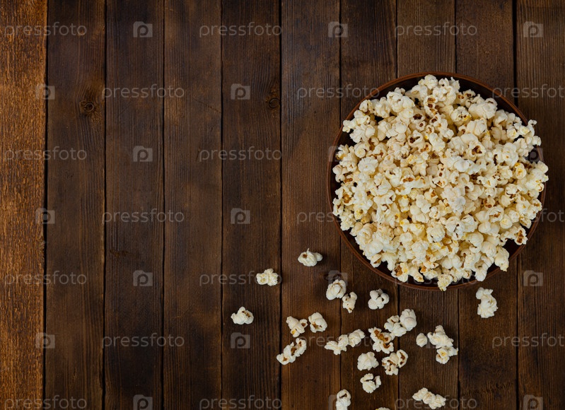 Чаша вкусного попкорна на деревянном столе, вид сверху, место для копирования