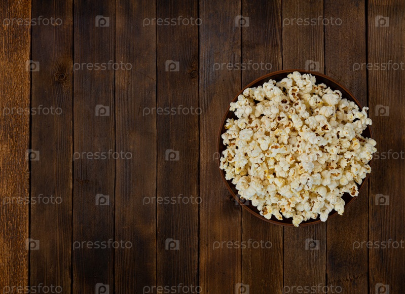Чаша вкусного попкорна на деревянном столе, вид сверху, место для копирования