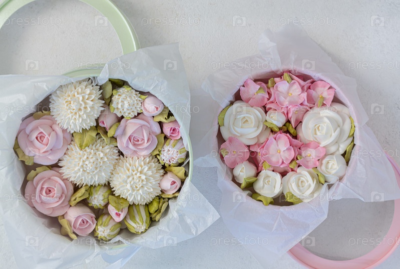Зефирный букет цветов в розовой коробке на сером фоне
