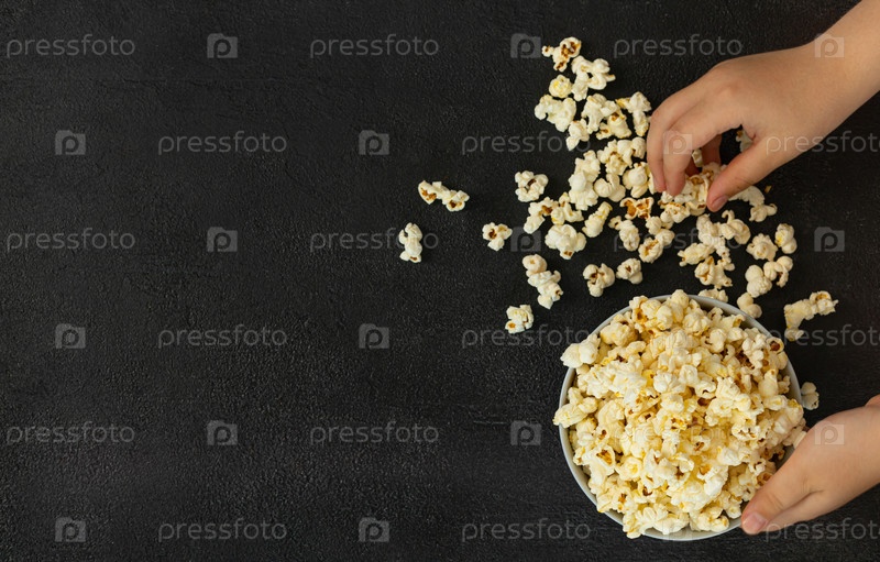 Чаша вкусного попкорна на темном фоне, натуральная вкусная еда для просмотра фильма