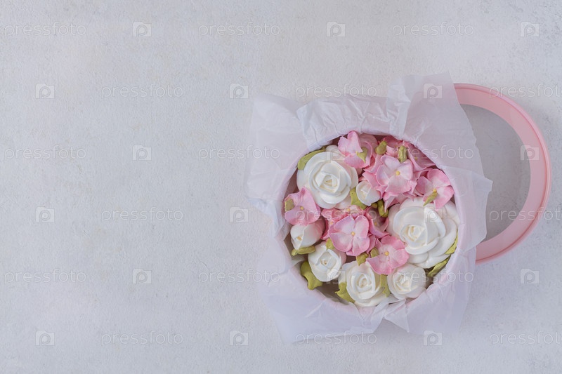 Зефирный букет цветов в розовой коробке на сером фоне