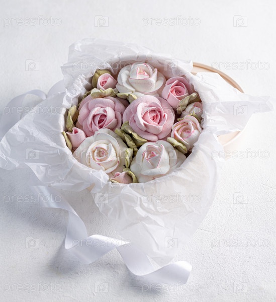 Домашний зефир в подарочной коробке на светлом фоне, красивый нежный букет цветов зефира, концепция праздника, подарки