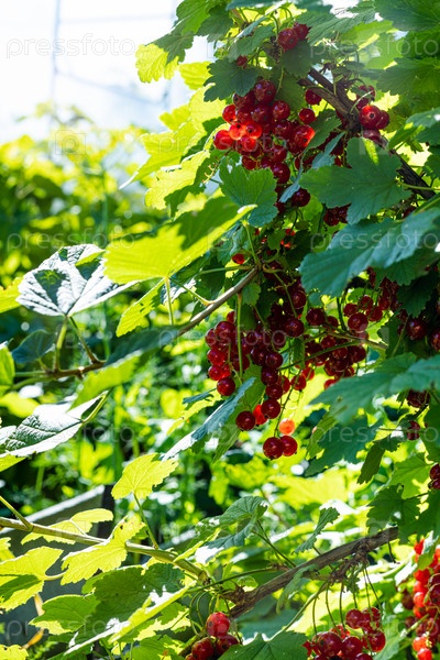 Кисть из ягод красной смородины и зеленых листьев. красная смородина, крупный план