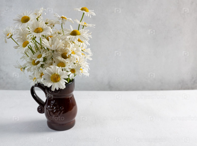 Красивый букет ромашек в вазе на светлом фоне, пространство для копирования
