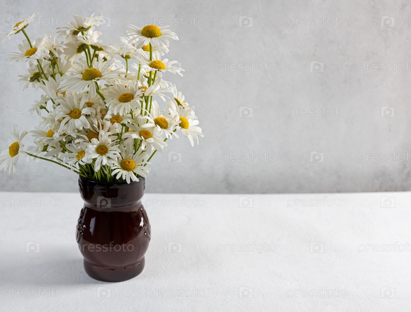 Красивый букет ромашек в вазе на светлом фоне, пространство для копирования