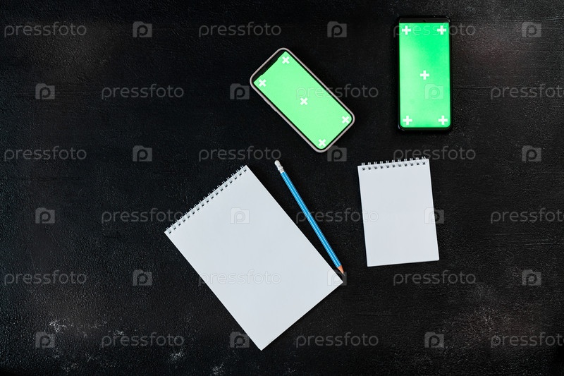 Мобильный телефон с зеленым экраном, шаблон макета мобильного телефона с зеленым экраном, цветовая клавиша, вид сверху