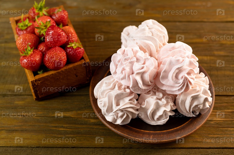 Домашний розовый зефир клубники или зефир на деревянном столе