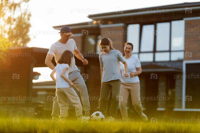 Счастливая семья играет в футбол
