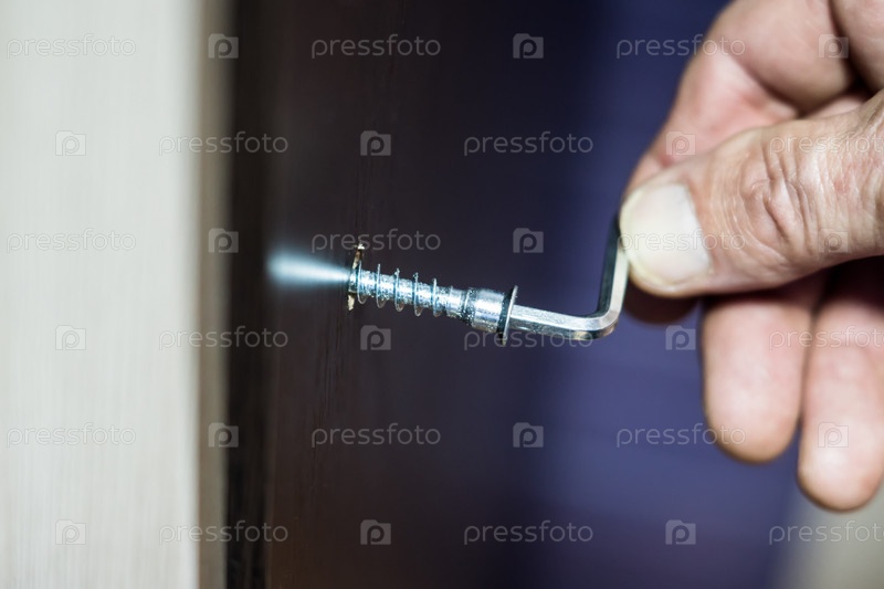 Сборка мебели, шестигранный ключ крупным планом в мужской руке