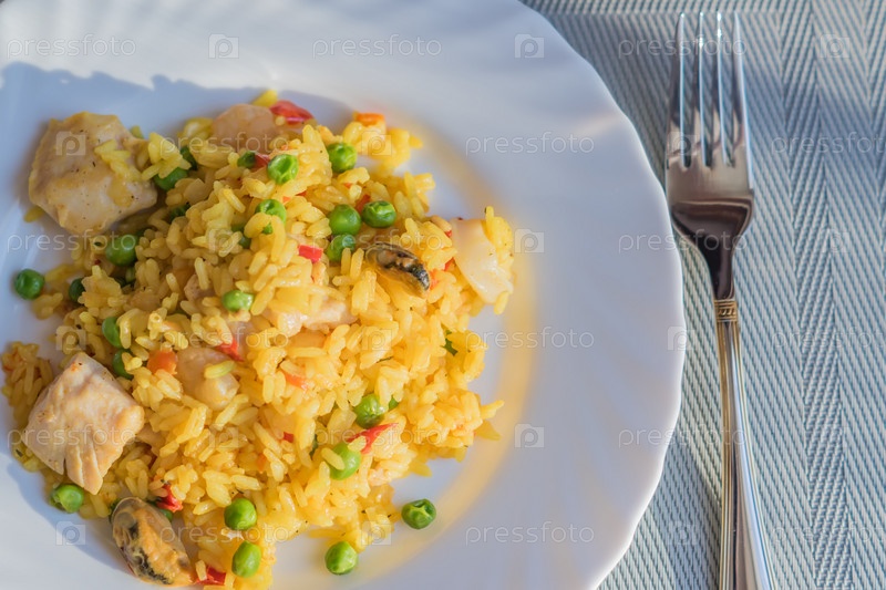 Паэлья с курицей и морепродуктами на белой тарелке. Испанское блюдо подается на стол