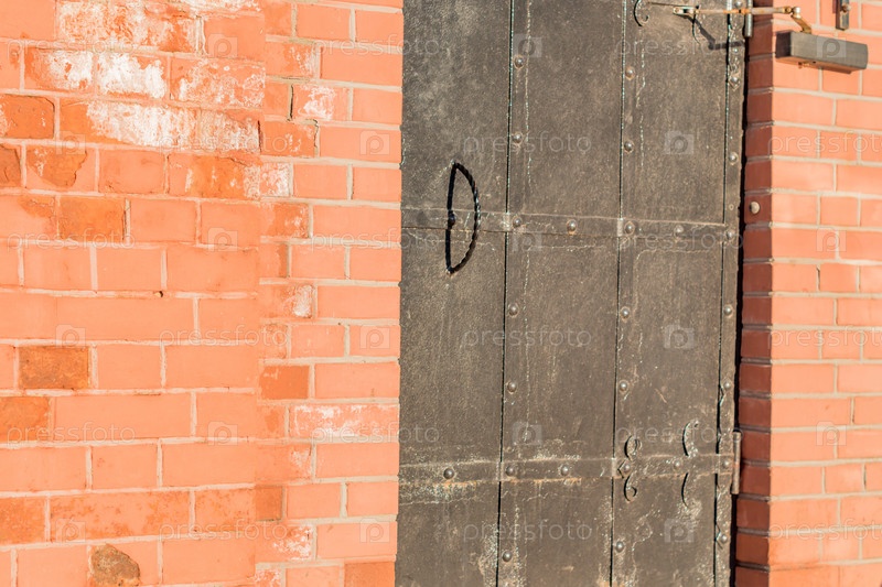 Фрагмент старинной черной металлической двери, конец стены из красного кирпича