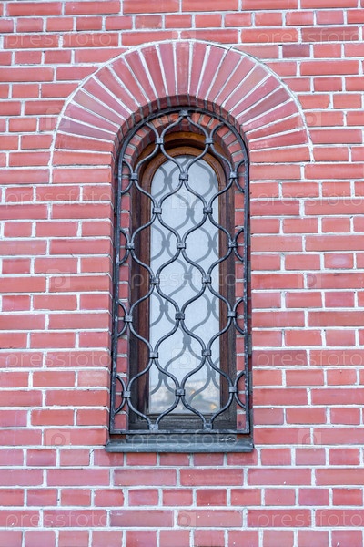 Красная кирпичная стена здания с деревянным окном за металлической решеткой