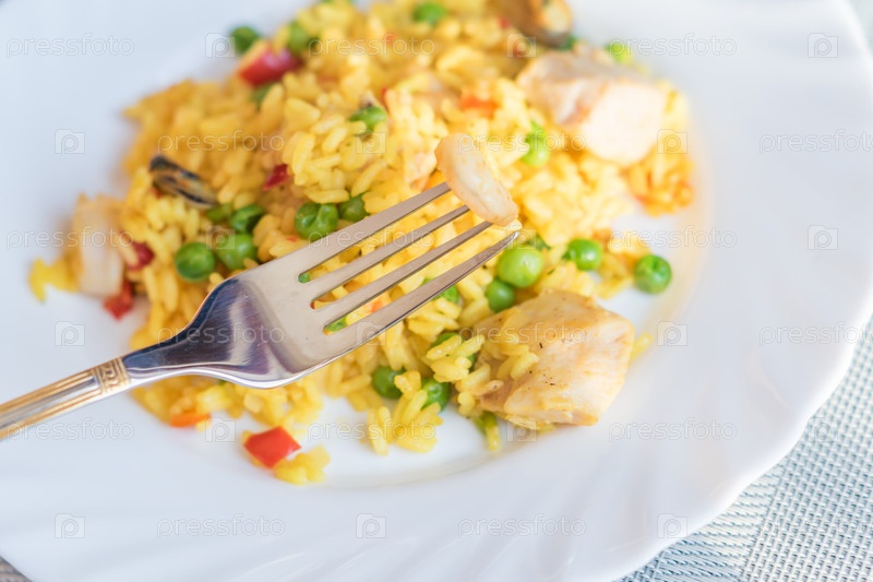 Паэлья с курицей и морепродуктами на белой тарелке. Испанское блюдо подается на стол. Креветки на вилке