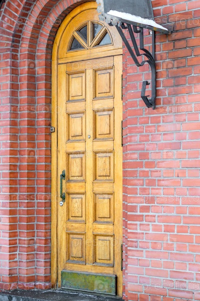Деревянная дверь и стена из красного кирпича крупным планом