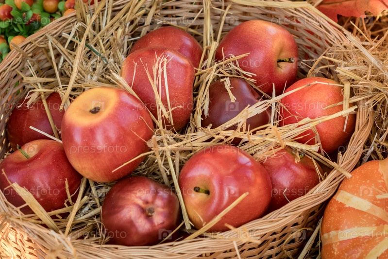 Красные яблоки в корзине. Урожай фруктов и овощей
