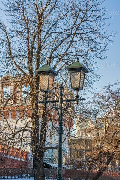Старинный фонарный столб на кремлевской стене и фоне голубого неба