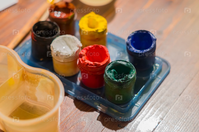 Набор гуаши, чистая вода, кисть. рабочее место художника готово к рисованию