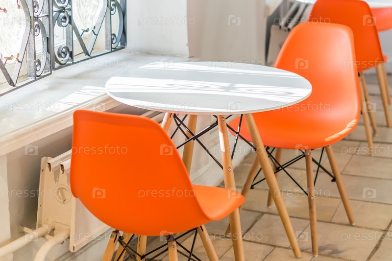 Крупный план интерьера кафе. Пластиковый оранжевый стул и круглый белый стол в современном стиле