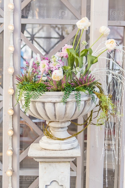 Цветущие цветы в большой вазе на улице в солнечный день, свадебное украшение